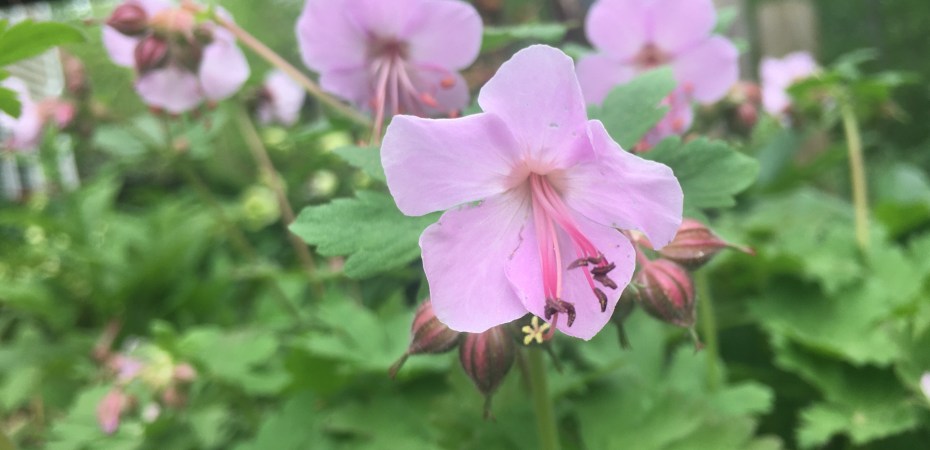 The Summer movement slows and stretches out — “clarinets and saxophones” perhaps –with summer phlox, wild geraniums (pictured), thread leaf coreopsis, cleomi (spider flowers), etc. in the ebbing and flowing of the dry times and the rains.