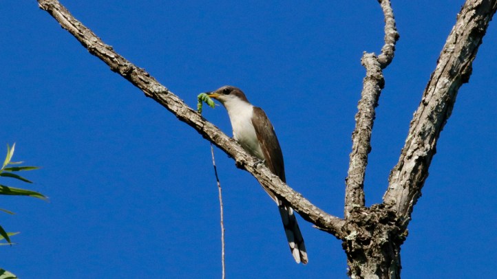 I shot this photo on the path near a meadow. She’s holding a caterpillar. This was a lucky shot because they often stay hidden. I was alerted to her presence by her unique call. They allegedly make this call before a thunderstorm thus the nick names of rain crow or storm crow. If you are Tolkien fan you’ll remember that one of Gandalf’s Nicknames was Storm Crow. Click on the image for a full size veiw. More info:https://www.allaboutbirds.org/guide/Yellow-billed_Cuckoo/overview